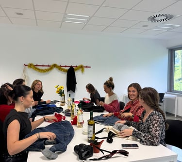Irati Arias, Irati Zamalloa y June Zubizarreta, estudiantes de Emprendimiento en la Universidad de Mondragón, organizan actividades, bajo su firma RE-VUELA, en las que los asistentes crean prendas y accesorios únicos mientras conocen gente nueva y brindan por una moda circular y sostenible